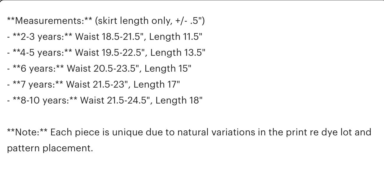 Recibirás UNA falda con tirantes para niñas. Debido a la naturaleza del estampado, la colocación del patrón puede variar y la tela tiene variaciones de estampado naturales.