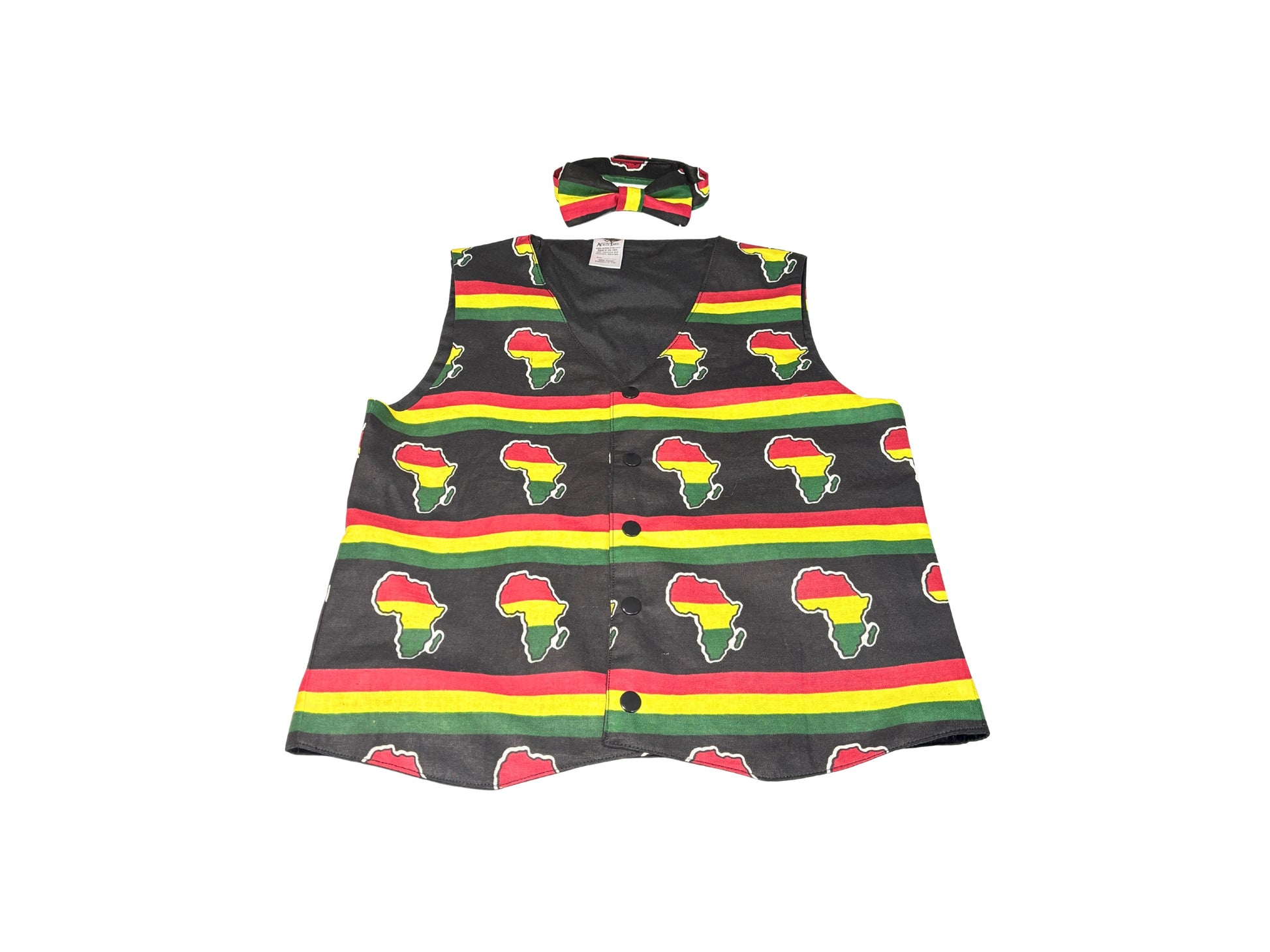 This vibrantly printed Amari Africa continent map vest features a colorful depiction of the African continent. A statement piece for any little boy's wardrobe, it showcases shades of green, red, and golden yellow. Fully lined with black cotton and secured with child-safe Kam snaps, it also comes with a bow tie that has a soft hook and loop adjustable neckband.