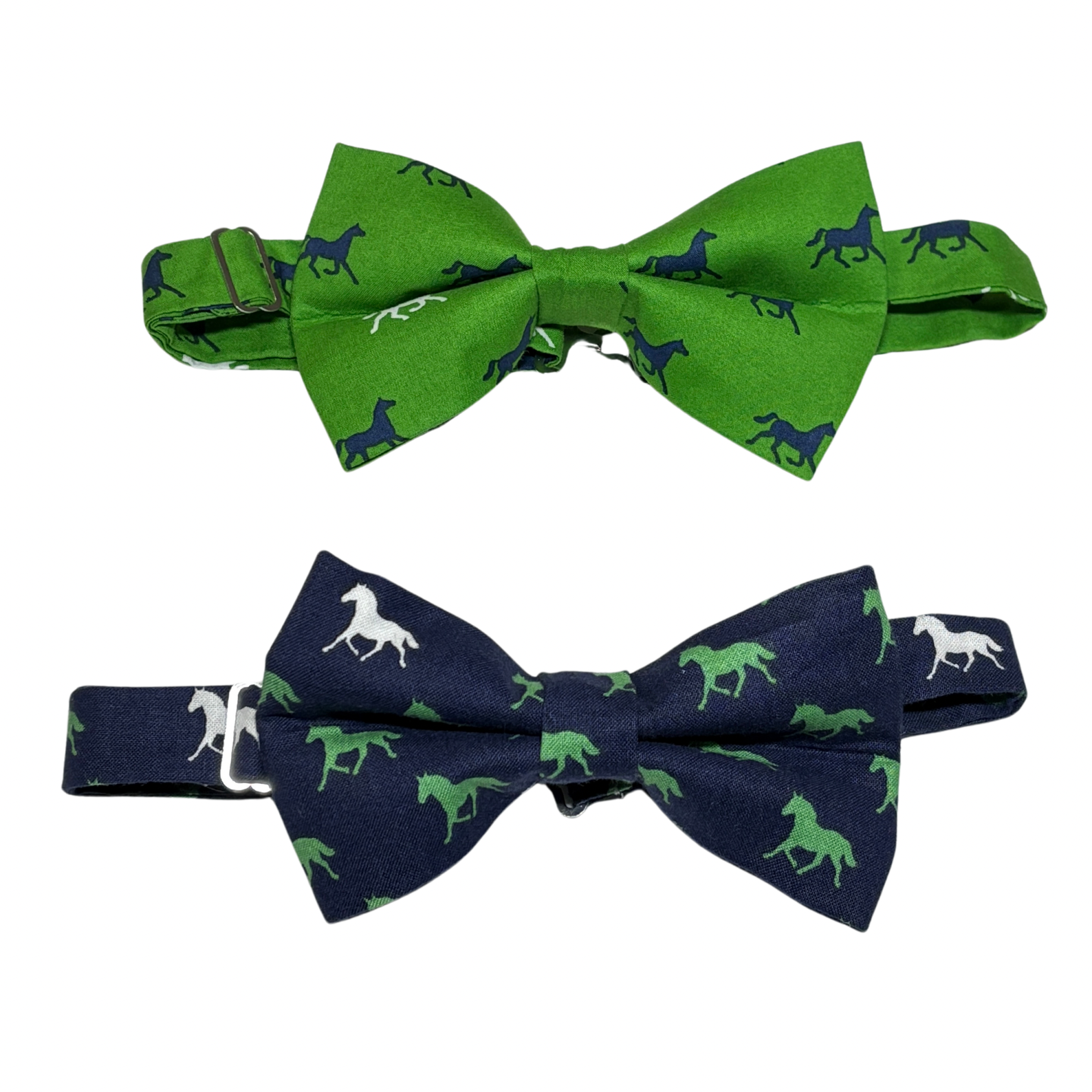The set includes Navy with Green and White horses print bow tie and the second is Green with Navy horses print bow tie. These horse-themed bow ties feature a metal adjustable closure for a secure and comfortable fit.