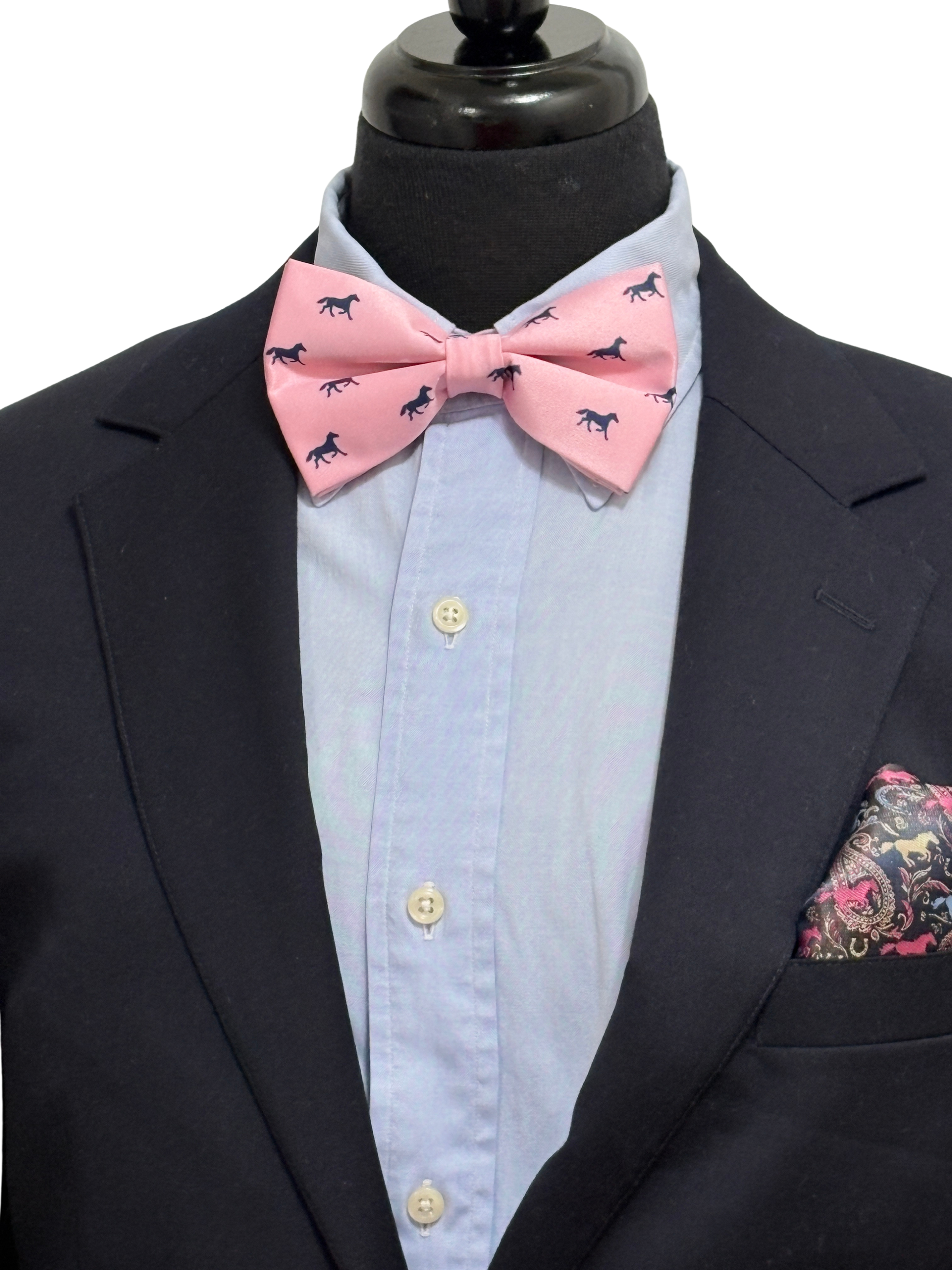 Our luxe satin fabric features a slight sheen and a playful print of galloping horses in carious cord. colors. Unlike our standard cotton bow ties, both the jacquard and satin finish gives your look an extra edge for race day, weddings, or gifting to the horse lover in your life.