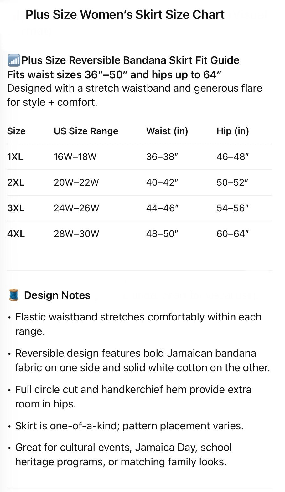 Looking for a plus-size Jamaican bandana skirt that celebrates your curves and your culture? This handmade reversible skirt is a bold cultural statement piece, designed for Jamaican Independence Day, heritage festivals, cultural school programs, and Caribbean expos. Made from authentic Jamaican red-white-and-blue bandana plaid cotton and crisp white cotton on the reverse, it’s stylish, breathable, and designed to fit waist sizes 39” to 52” with ease. Made for Real Bodies, Real Movement